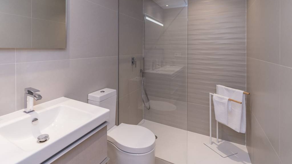 badkamers, brede openslaande deuren naar het terras, hoogwaardige keukenapparatuur en sanitair, LED-verlichting, airconditioning en vloerverwarming in badkamers, allemaal standaard.