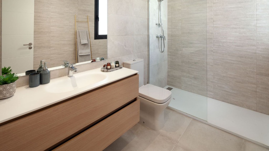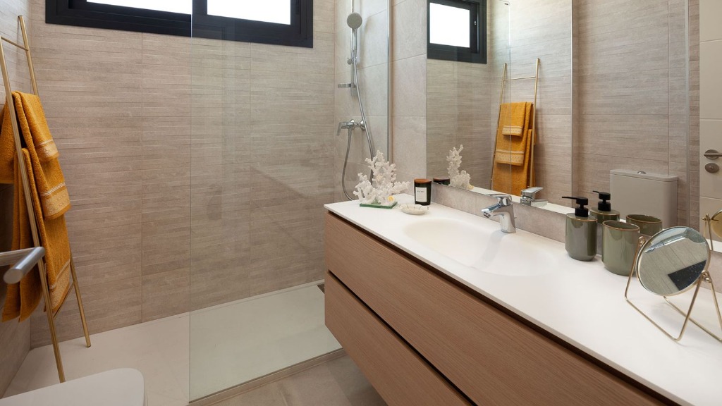 Tous les appartements disposent de 2 salles de bains, avec buanderie séparée. Dans la typologie de 3 chambres, cette buanderie sert également de toilettes invités.