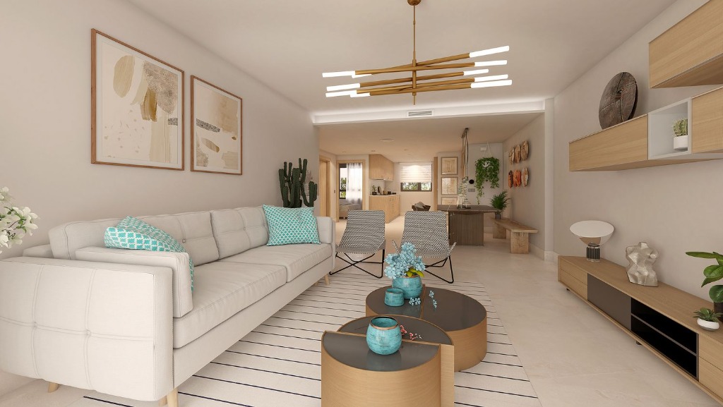 Solemar offers spacious homes designed in the style of the “total living” concept, where the living room, kitchen, and terrace are integrated into a single living space.