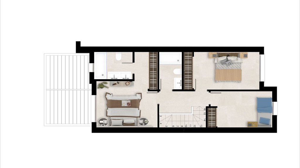 Les maisons avec 3 chambres ont 220m2 de surface de construction répartie sur 3 niveaux : parking avec sous-sol privé pour le stockage. Le premier étage est distribué avec une cuisine à aire ouverte, un salon et une salle à manger, toilette invitée et une grande terrasse. 3 chambres au deuxième étage avec placards et deux salles de bains, une en suite.