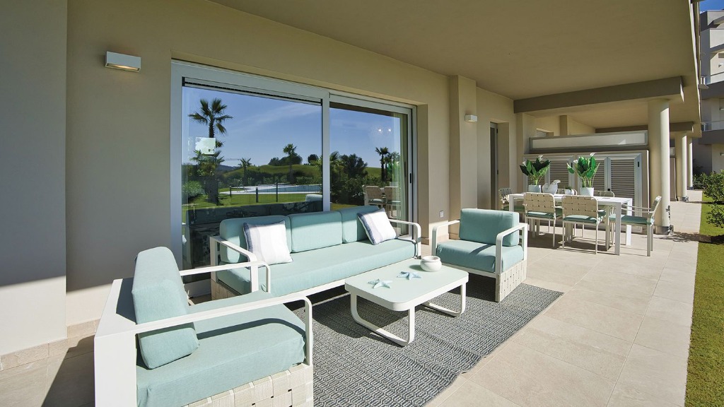 Tous les appartements disposent de grandes terrasses avec des balcons en verre afin que vous puissiez profiter pleinement de la vue imprenable sur le parcours de golf et les appartements du rez-de-chaussée disposent également de jardins privés avec vue sur la piscine, les jardins du complexe et le parcours de golf qui entoure le développement .