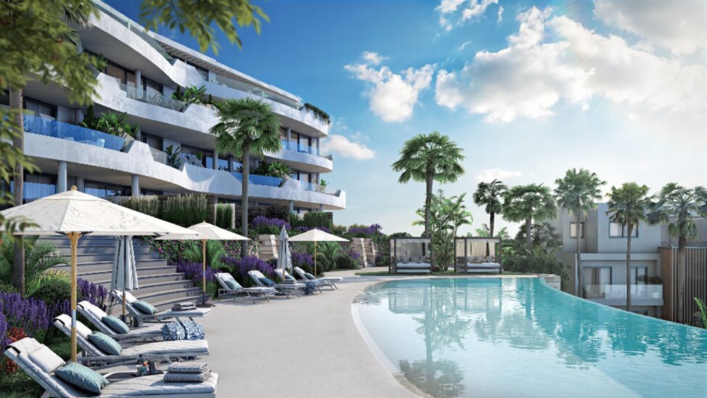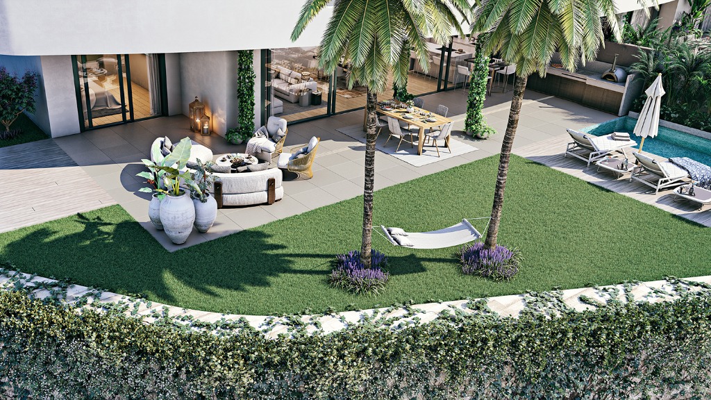 Omgeven door groene zones en met een prachtig uitzicht, bevinden de appartementen zich aan de zuidkant van de gemeenschap, op slechts een paar honderd meter van onze privéstrandclub, met de winkels en restaurants in de omgeving binnen handbereik.