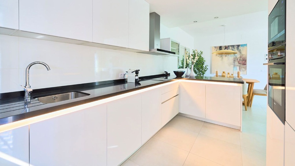 De begane grond heeft een grote open ruimte met een woon-eetkamer en keuken, met directe toegang tot de privétuin.