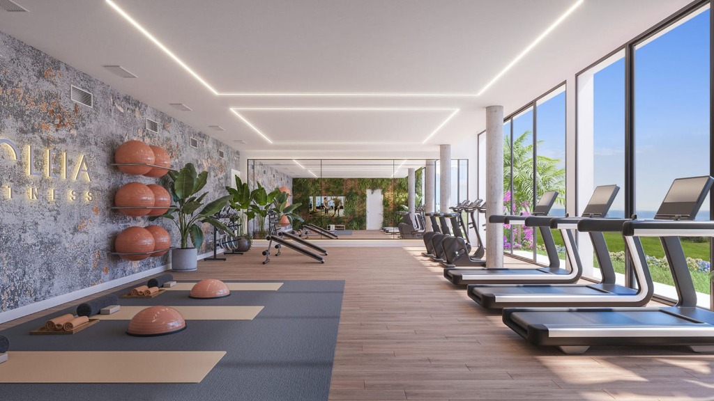 De gemeenschappelijke ruimtes omvatten een groot zwembad met solarium, een fitnessruimte, sauna en Turks bad, een coworkingruimte en sociale buitenruimtes.