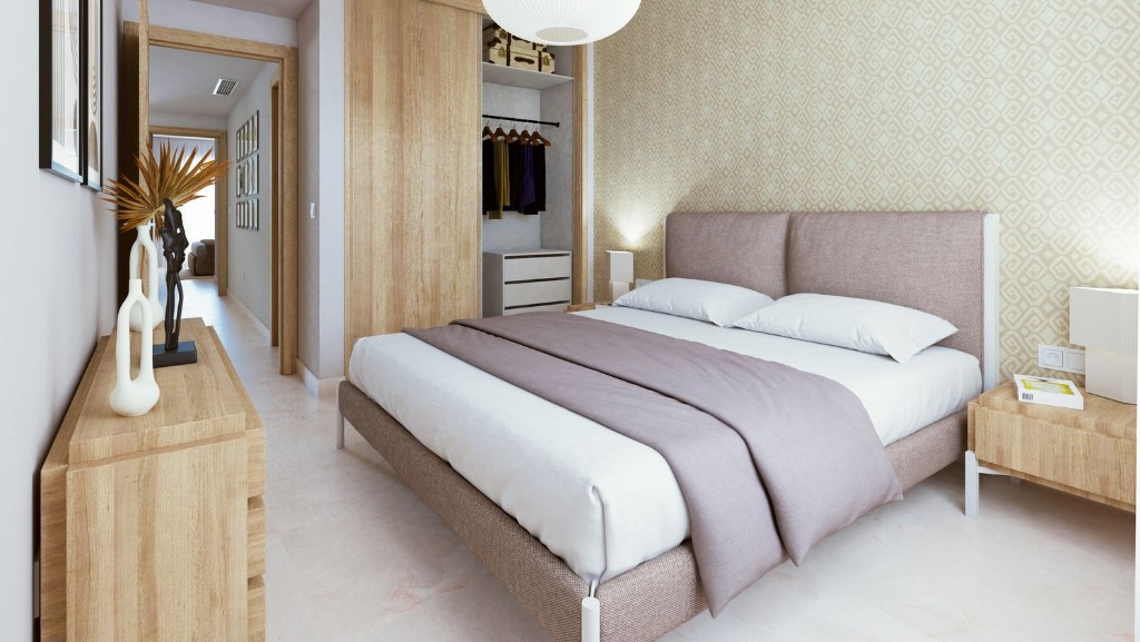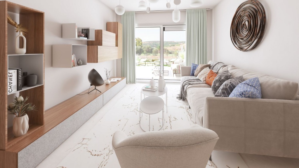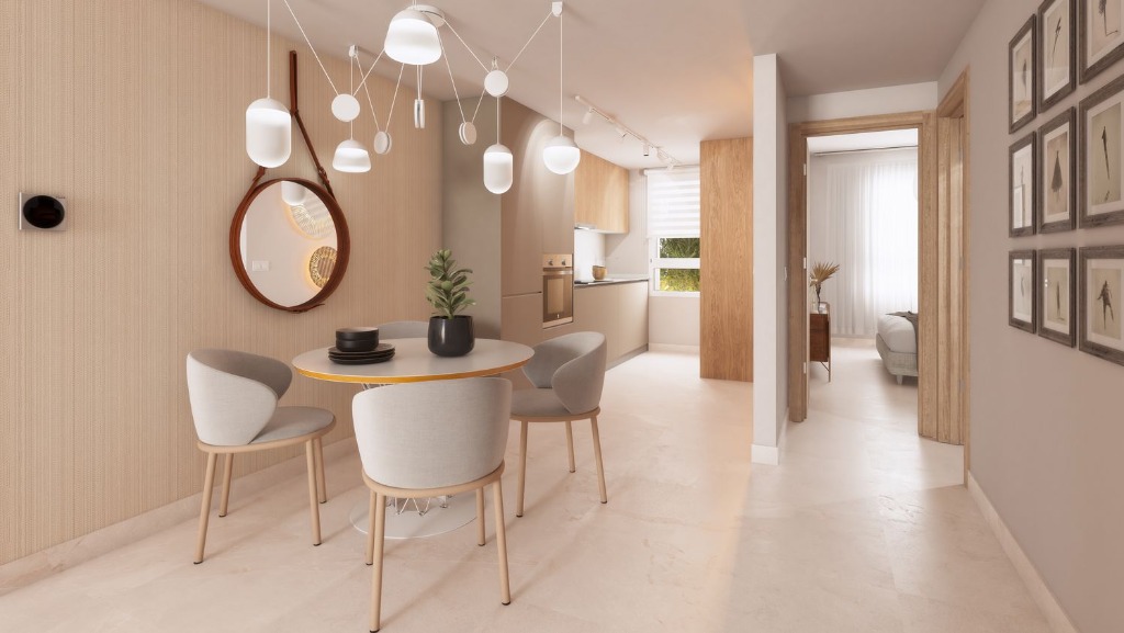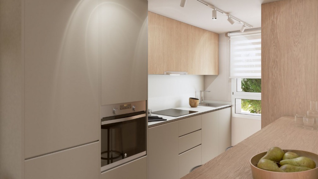 De appartementen met 2 en 3 slaapkamers en 2 badkamers hebben een ruime woonkamer met geïntegreerde keuken die uitkomt op het terras, wat zorgt voor maximaal natuurlijk licht en een gevoel van ruimte.