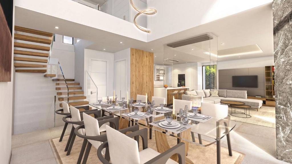 The development has been designed to maximise indoor-outdoor living. Natural light floods through every corner of the property and each living space has been carefully crafted to seamlessly flow from the stylish interior to the immense exterior terraces. Set on 2 floors, these spacious villas have double height ceilings in the living room, enhancing the sensation of space and light. The clever use of glass ensures that views across the garden and out towards the horizon are always free from obstruction.