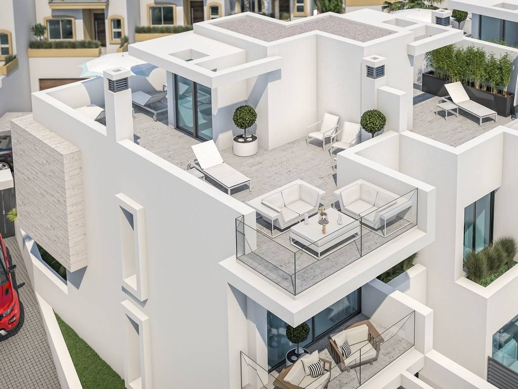 Totaal bebouwde oppervlakte van 290 tot 317 m2. Alle huizen hebben 3 slaapkamers, 2 complete badkamers + 1 gastentoilet, open moderne keuken, grote woonkamer en privétuin, ondergrondse garage voor 2 wagens & grote berging en solarium met mooi uitzicht.